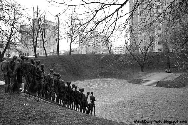 This memorial is known as "The Death Pit". In 1942 Nazi killed 5000 Jews at this same place. The number of Minsk ghetto prisoners killed during WWII is about 100,000. The marble obelisk was built in 1947. It was USSR's first monument to Holocaust victims. The sculpture was added in 2000.